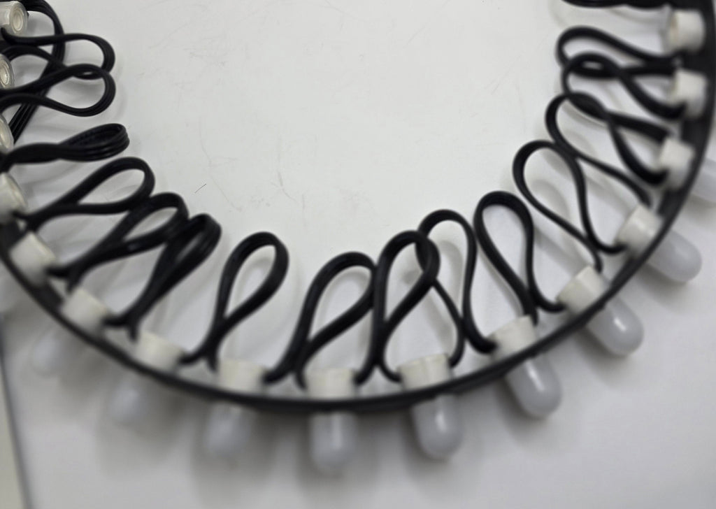 Each 100-node string weighs about a pound, and we back them with a 2-year factory warranty for defects.