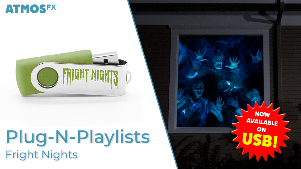 It just wouldn’t be Halloween without a few good-natured scares – and with the Fright Nights Plug-N-PlayList, it is hair-raisingly easy! Entertain the entire neighborhood with this dynamic collection of ghosts, ghouls and creeps, designed expressly for first-time digital decorators. Choose Fright Nights on a pre-loaded USB drive, or download immediately and save to your own storage device. This seamless collection of AtmosFX’s most popular scary decorations has been re-formatted as a single digital file, making it a cinch to display. Simply plug the USB into your projector, TV, or media player and press play!