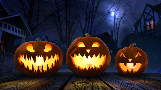 Three pumpkins prepare for their favorite Halloween pastime – scaring others and each other!