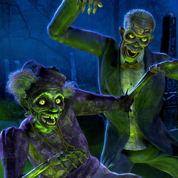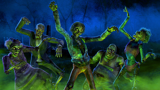 They’re not alive but these zombies are more than lively! In the Halloween Zombie Bash Decoration Collection, a cast of zany zombies dance, jam, and spook their way into your heart — and if you're not careful, into your brain. Includes three lively dance routines, a five piece undead band playing a macabre tune, and two sets of playful scares — one silly and one a bit spooky.