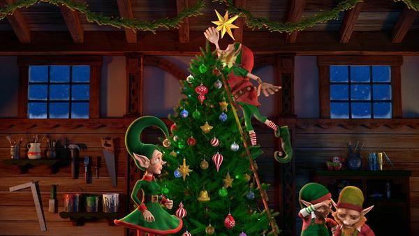 Ingenious elves trim their Christmas tree with tinsel, lights, and a crowning star.