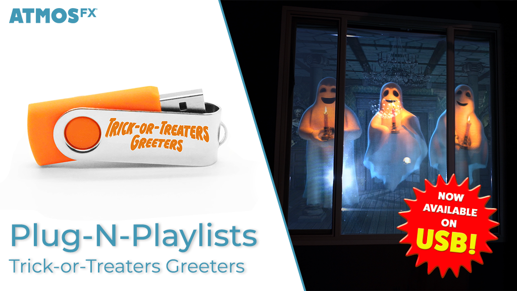 Bring joy to your doorstep this Halloween with an engaging cast of ghosts, witches and jack-o’-lanterns – all of whom are eager to meet your nighttime visitors! Trick-or-Treater Greeters Plug-N-PlayList is designed expressly for first-time digital decorators who want to create a dynamic display that is sure to delight the neighbors, young and old. Choose Trick-or-Treater Greeters on a pre-loaded USB drive, or download immediately and save to your own storage device. This seamless collection of AtmosFX’s most popular family-friendly decorations has been reformatted as a single digital file, making it easy to display on your windows or TV. Simply plug the USB into your projector, media player, or TV, and press play!