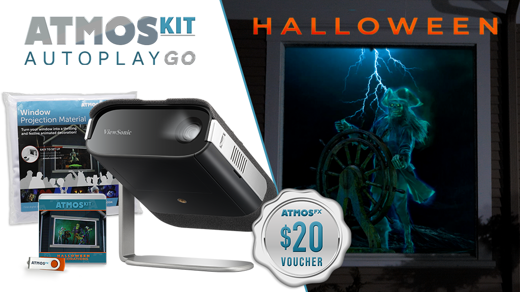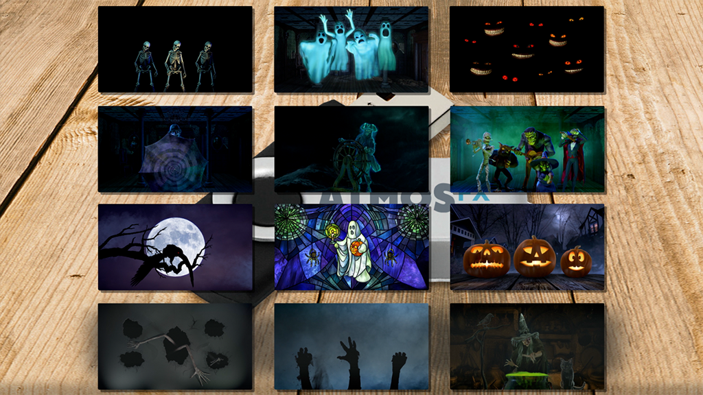 Every AtmosKIT Autoplay GO Halloween features a 4 GB USB drive packed with 12 of AtmosFX’s most popular Halloween decorations, offered in both horizontal and vertical display modes for windows, including: