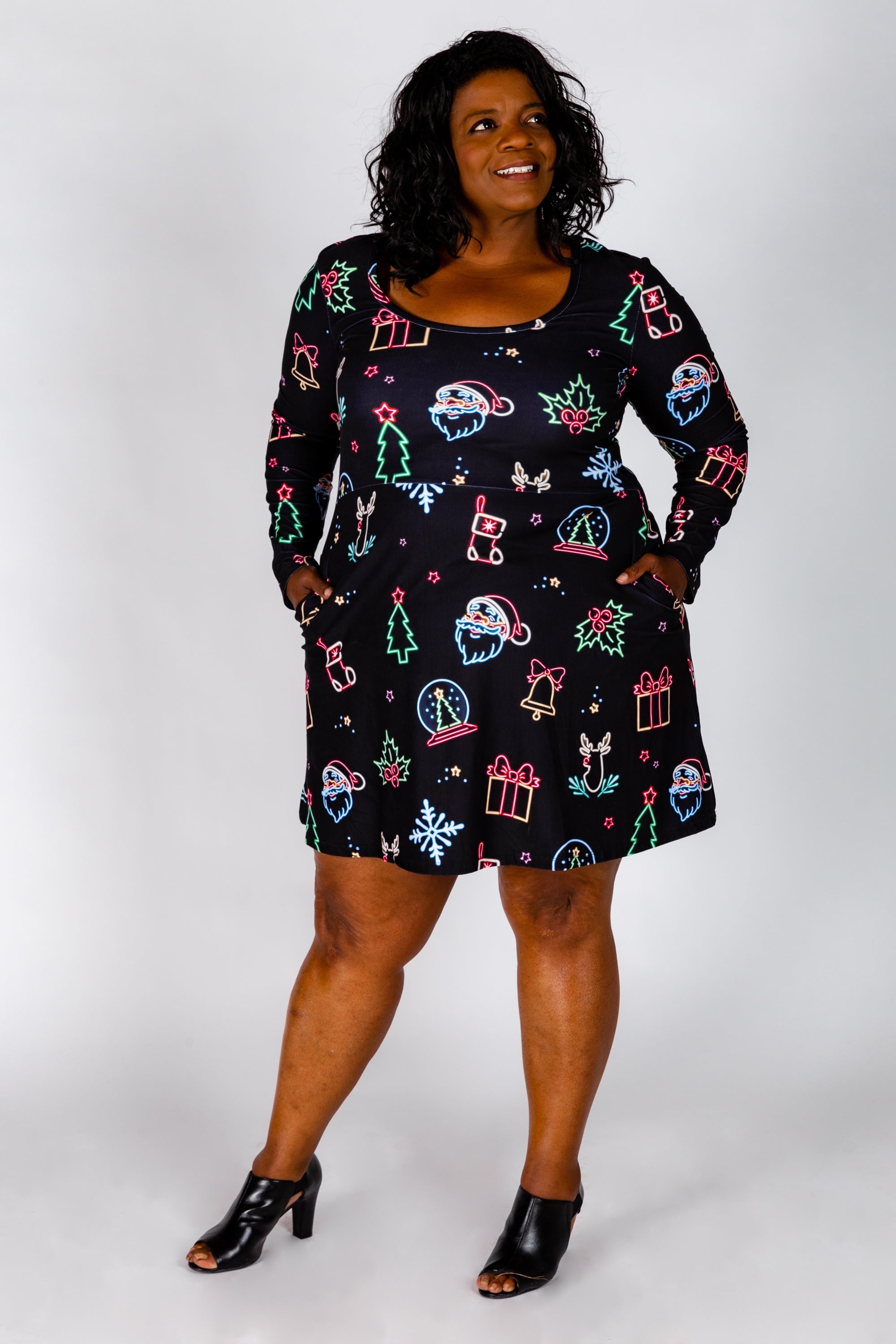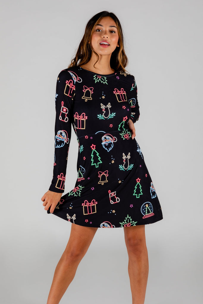 Remember back in the day when mom and dad would pile you and your siblings into the car with hot cocoa and drive around gawking at Christmas lights? There was always that one neighborhood filled with overachievers who went balls to the walls with Christmas tunes and neon light synchronization. This neon print skater dress captures the essence of that feeling with just a little touch of naughty.